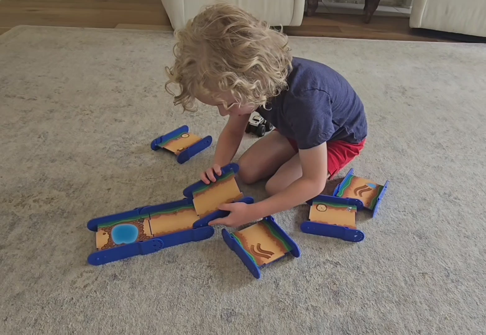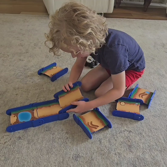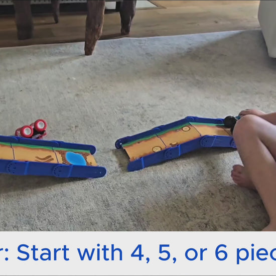 Flip track pieces between off-road and street themes, and create multi-ramp setups for collaborative play, solo challenges, or creative building projects.